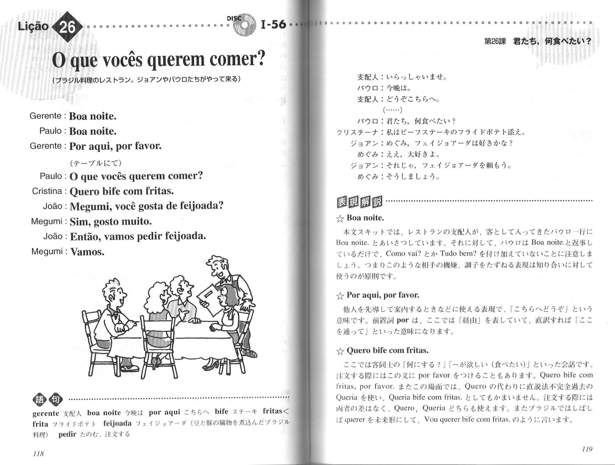 ます。で、パウロがポアノイチって答えますね。で、ポイさんが、ポラキポルファボール といって、テーブルに連れていきます。で、テーブルで、 パウロが、オッケー、ポーセスケレンコメール聞きます。で、クリスティーナが、クリスティーナもいるんだね。ケロビフィコンフリタスますね。で、ジョアンが、
